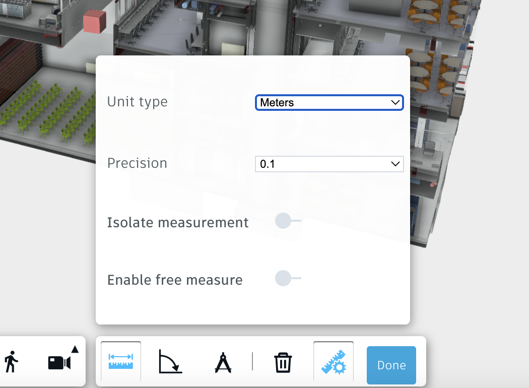 Dimensions can be created in both 3D and 2D views. The dimension tool becomes visible in the View Toolbar when it is available. Clicking on the dimension tool will reveal a sub-menu containing various dimension options. To exit the dimensioning mode and return to the standard view toolbar, click "Done".